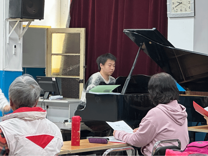 在敬老月活动的温馨氛围中,10月30日上午,我们学生柏淇舜与李安珂受邀前往校离退休处,为退休教师合唱团担任钢琴伴奏。用悠扬琴声为退休教师们的合唱时光增添温情,既践行了敬老爱老的传统美德,也让学子在实践中传递音乐的温暖力量。
