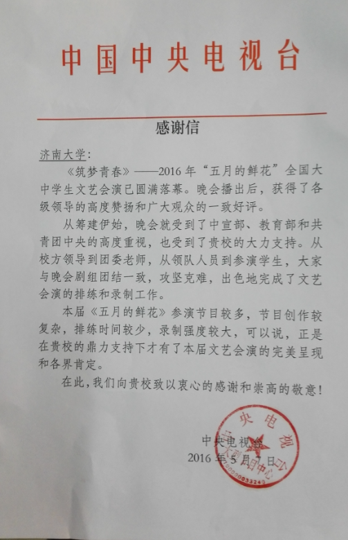 4月30日,suncitygroup太阳集团舞蹈系学生成功地参演了《筑梦青春》——2016年“五月的鲜花”全国大中学生文艺会演。近日,中央电视台向我们发来感谢信,感谢我们在此次会演中所作的各项工作。感谢信的具体内容如下: